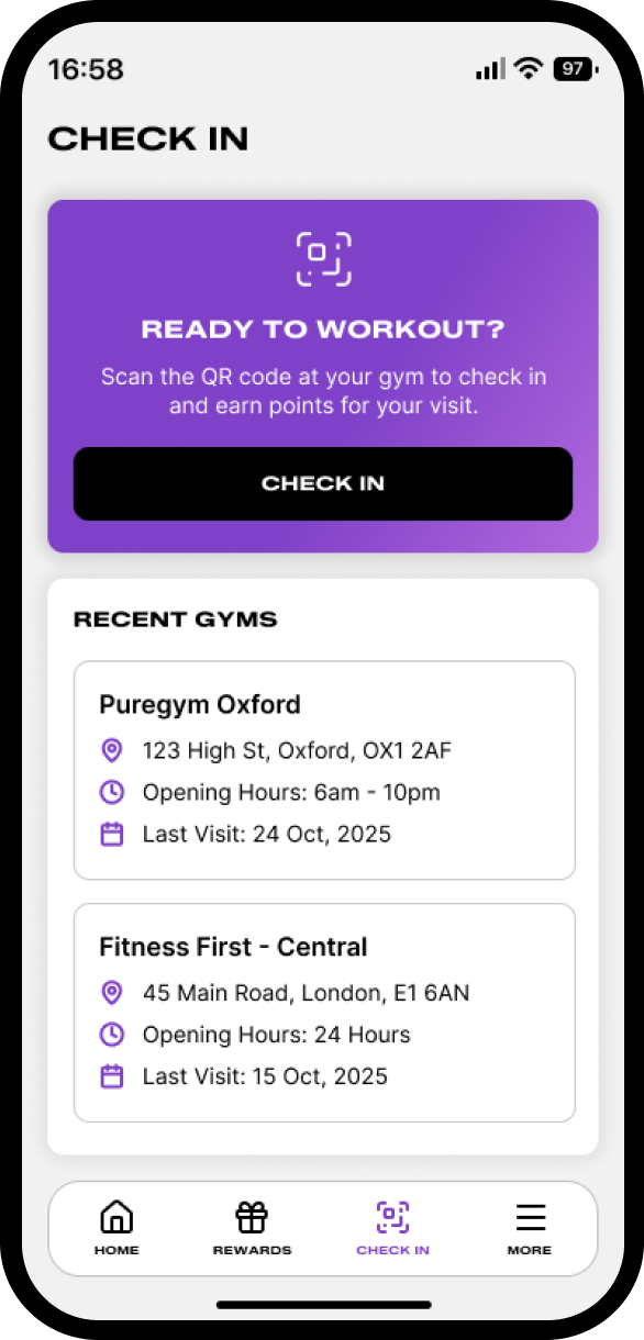 Open the app, scan the code, and you’re checked in. Every scan adds to your progress, making it effortless to track activity and earn rewards.